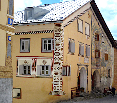 In the Engadine Valley (St Moritz area), the most characteristic feature of the traditional buildings is the use of the s'graffito technique as outside decoration.