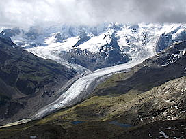 Just before the Alp Grüm station, the first of the mighty glaciers comes into view on the left - the Palü glacier below the Piz Palü peak.