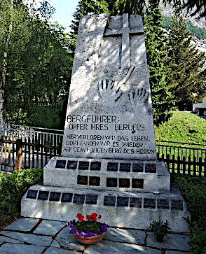In memory of the Zermatt mountain guides who lost their lives as they practised their profession; engraved in the stone: (translation) “Mountain guides: victims of their vocation. Here, we lost our lives. Up there, we found life again. On the holy mountain of the Lord.”