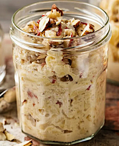 The dish consisted of oat flakes mixed with milk, yoghurt, grated apple, hazelnuts and almonds and left in the fridge overnight.