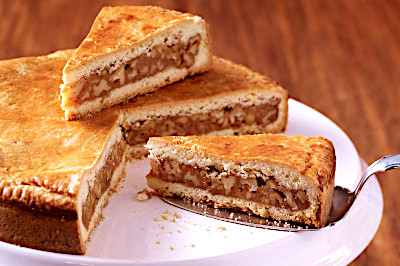 A delicious vegetable pie filled with potatoes, onion, leeks, pears (or apples) and cheese.
