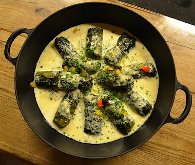 Rolls of Swiss chard filled with Spätzle dough covered with a cheese sauce.