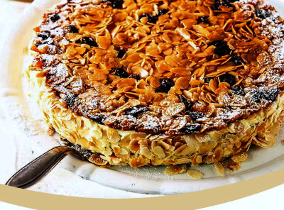 A combination of shortcrust pastry, vanilla buttercream and a topping of Florentine decoration.