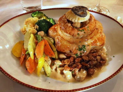 A vol-au-vent (flaky pastry) filled with balls of sausage-meat and mushrooms in a white sauce; often served accompanied by sultanas soaked in brandy.