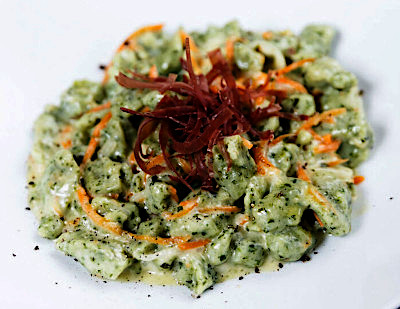 Spinach dumplings in a cheesy sauce with shavings of air-dried beef