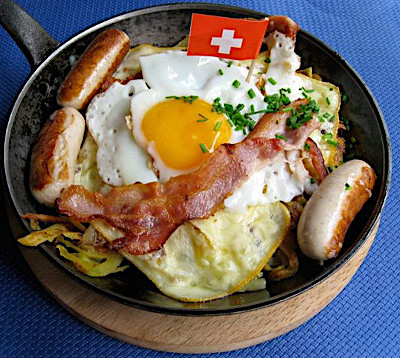 The dish originated in the German-speaking region and has become the unofficial national dish of the Swiss-German regions. Originally it was a breakfast meal commonly eaten by farmers.