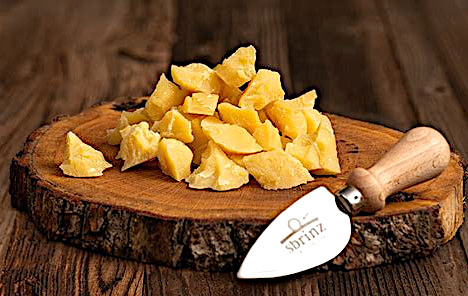 This cheese is „blind“, i.e. it doesn't have any holes, and is slightly brittle which makes it particularly suitable for grating. Its flavour is a little salty and full-bodied.