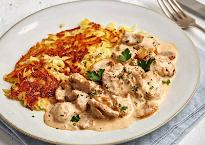 A dish of thinly-sliced veal strips quickly seared in butter, then cooked with chopped onions and mushrooms, white wine and cream; traditionally served with Rösti.
