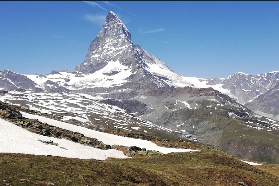 The first 3,400 m (11,150 ft) of the Matterhorn peak is a mix of sedimentary rock (chalk, limestone, shale) with mostly ocean crust from the long-gone Tethys Sea.