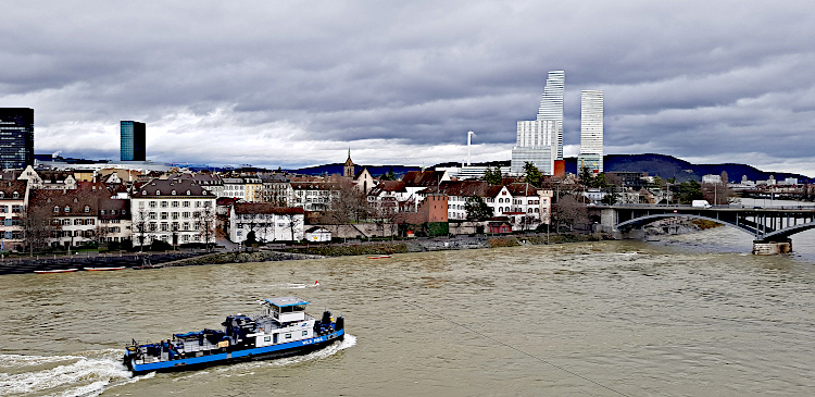 Location - a seagoing-cargo port city on a strategic location on the Rhine River knee and at the furthest navigable point from Rotterdam - an age-old major junction on N-S and E-W transit routes. It lies 244 m above sea level - lowest altitude of all Swiss cities north of the Alps;