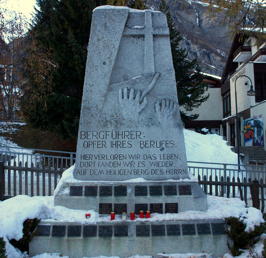 In memory of the Zermatt mountain guides who lost their lives as they practised their profession; engraved in the stone: (translation) “Mountain guides: victims of their vocation. Here, we lost our lives. Up there, we found life again. On the holy mountain of the Lord.”