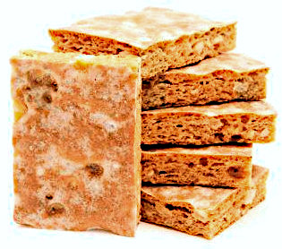 Traditional cookies with a hard crust and chewy insides, made of honey, almonds, candied peel, and spices such as cinnamon, cloves and nutmeg. The dough is cut into rectangles while still hot, then a sugar glaze is added on top.