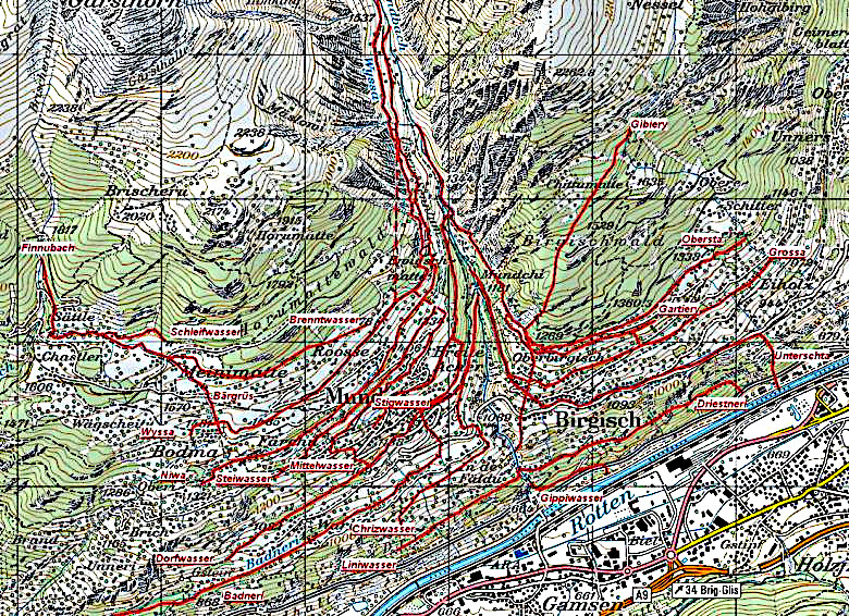 From the 13th century an ingenious method of diverting glacial meltwater from mountain streams to parched pastures and vineyards at lower elevations was developed. These water channels are known as "Bisses" or "Suonen" depending on which dialect is used.
