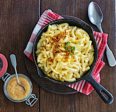 Basic ingredients are macaroni, potatoes, cheese, cream and fried onions; can also add bacon or ham.