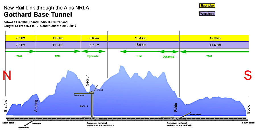 To solve the problem, a route that required a 15 km (9,3 mile) tunnel under the Gotthard pass itself along with 7 additional long spiral tunnel approaches was designed. These spiral tunnels allow the trains to gain/lose height at a steady 7% gradient by increasing the distance the train travels