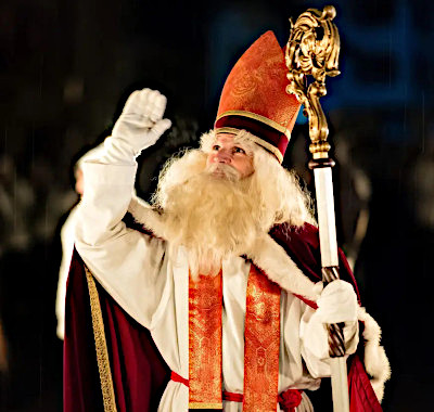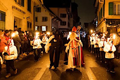 After the last of the Iffeli have passed by, along comes St Nicholas accompanied by 9 torch bearers and 4 attendants known as "Schmutzlis" painted black to represent the "shadow personality" (not racist black-face!).