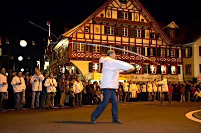 First come the loud "Geiselchlöpfe", the whipcrackers producing explosive sounds louder than large firecrackers. The usually young men show off their skills by cracking their whips from side to side or above their heads using only one arm.
