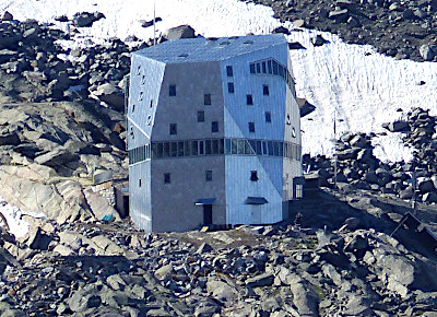 When standing at the Gornergrat station, look for the lake below the Monte Rosa peak, go up the ridge at 2 o'clock and look for a tiny shiny object. This is what the building looks like from close up