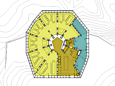 ETH Architecture Prof Andrea Deplazes led a multi-disciplinary team of professors and students to design a building that is considered Switzerland’s most complex wooden structure. The 5-story polygonal building was built on stainless steel foundations; it has a spiral interior and staircase of wood. It was constructed in modules that were helicoptered to the site to be fitted together in situ.