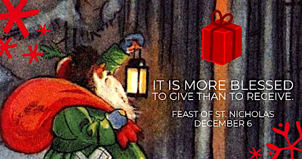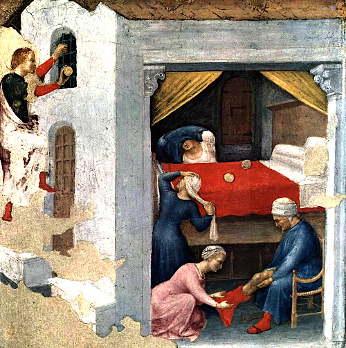 According to legend, he saved 3 sisters from a very poor family from being forced into prostitution by secretly dropping a purse of gold coins through their house window at night for 3 nights so their father had enough to pay dowries for all the daughters.
