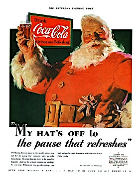 Coca-Cola commissioned illustrator Haddon Sundblom to paint Santa for Christmas adverts. Those paintings established Santa as a warm, happy character with human features, rosy cheeks, a white beard, twinkling eyes and laughter lines.